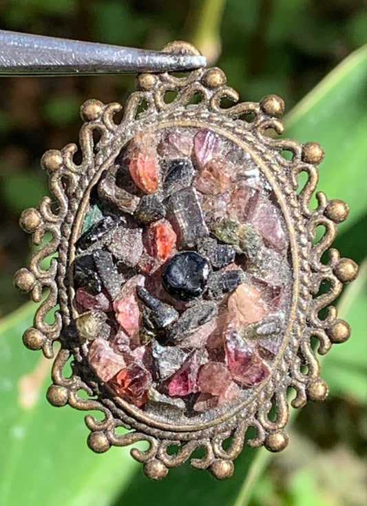 Médaillon couleur Bronze avec Tourmaline multicolore, de 36 mm de ht x30 x 8. Vendu avec un cordon noir réglable !