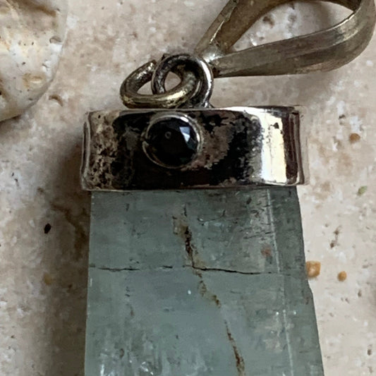 Aigue-marine, pendentif sertis sur Argent avec tourmaline noire sertis ! Pièce unique de 38 millimètres de hauteur x 12 millimètres de largeur x 8 d'épaisseur. Vendu avec cordon réglable de couleur noire. Fait au Pakistan !