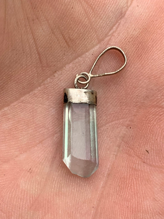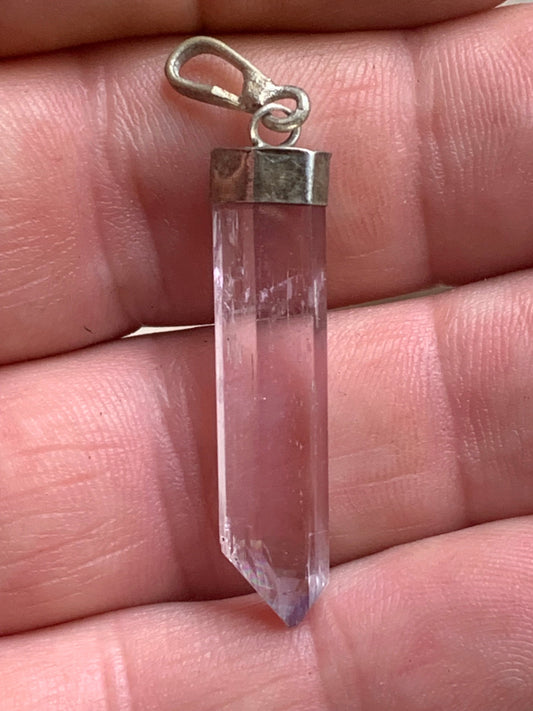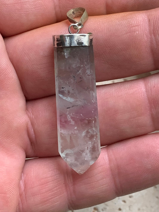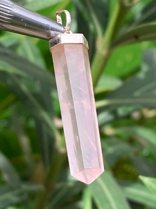 Cristal de roche/ Quartz rose ! Pendentif pointe/ laser en Argent, de 42mm de hauteur x 8 de diamètre. Vendu avec cordon réglable de couleur noire !