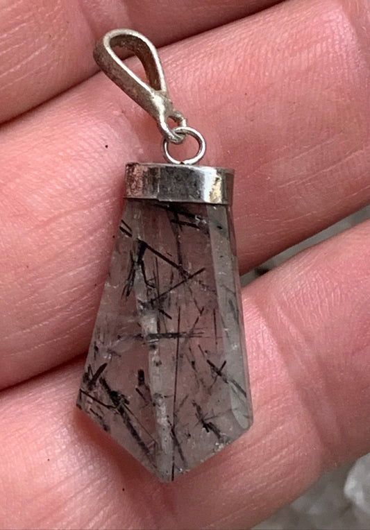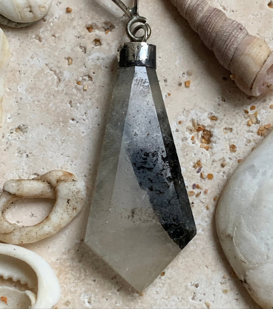 Cristal de roche/ quartz avec inclusions de tourmaline noire ! Pendentif en Argent, 39 mm de hauteur x 12 de largeur x 5 d'épaisseur. Vendu avec cordon réglable de couleur noire !