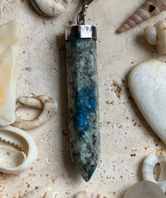 Jaspe K2* (Granit avec Azurite), pièce en Argent 0925 rhodié, de 58 millimètres de hauteur x 8 millimètres de largeur x 8 d'épaisseur. Vendu avec un cordon réglable de couleur noire !