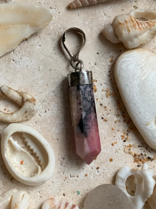 Rhodonite, pièce unique en Argent de 37 millimètres de hauteur x 8 millimètres de largeur x 7 d'épaisseur. Vendu avec un cordon réglable de couleur noire !