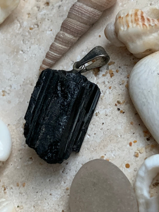 Tourmaline noire, pendentif de 29x11x11mm. Vendu avec un cordon réglable de couleur noire !