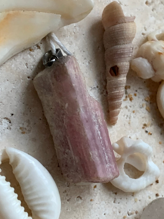 Tourmaline rose dit Rubellite, pendentif de 33x11x11 mm. Vendu avec un cordon réglable de couleur noire !