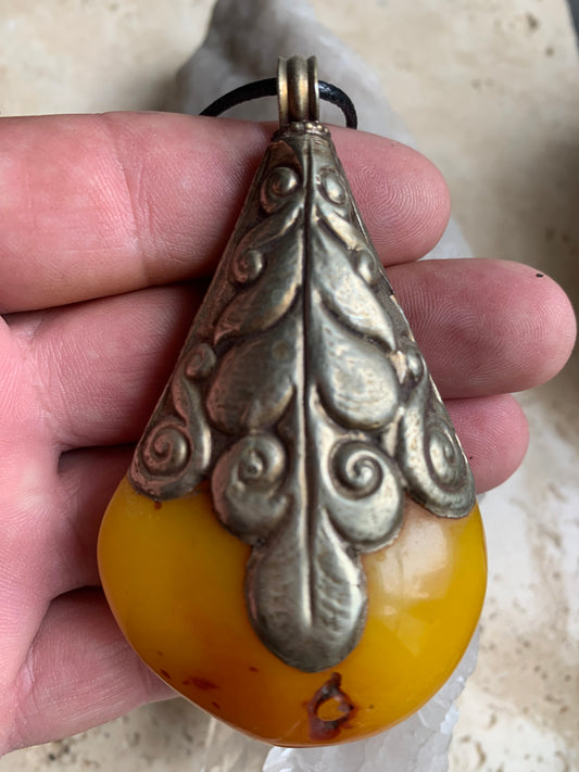 Pendentif en Copal (famille de l'Ambre), sertis en métal avec de majestueuses gravures. Impressionante pièce de 85 x 50 x 30 millimètres. Fait au Népal🇳🇵, un bijou ethnique unique et authentique (vendu avec cordon coulisant) !