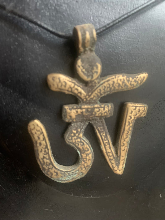 Om, symbole sacré en métal (laiton), taille de 60x50x10 millimètres. Pièce authentique et unique faîte au Népal. Livré avec cordon coulissant, prêt à porté ou à offrir !