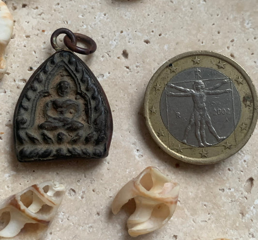 Bouddha de style (Tsa-tsa*), pendentif ancien de la divinité sacré en métal (laiton) et terre cuite, 30x20x7 millimètres. Pièce authentique et unique faîte au Népal. Livré avec cordon coulissant, prêt à porté ou à offrir !