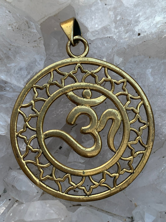 Om, pendentif en laiton doré de 3,6 centimètres de diamètre, vendu avec cordon noir réglable ! Tel un souffle ancien suspendu au creux du cœur, ce pendentif en laiton doré célèbre le symbole sacré Om, vibration originelle de l’univers !