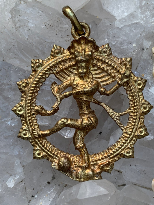 Pendentif en 'laiton argenté ou doré' de la divinité hindoue 'Shiva' sous sa forme de Shiva Nataraj. * Le roi (raja) de la danse (nata) est un symbole du mouvement éternel de l'univers, la danse cosmique. 4,5 cm de diamètre, vendu avec cordon !