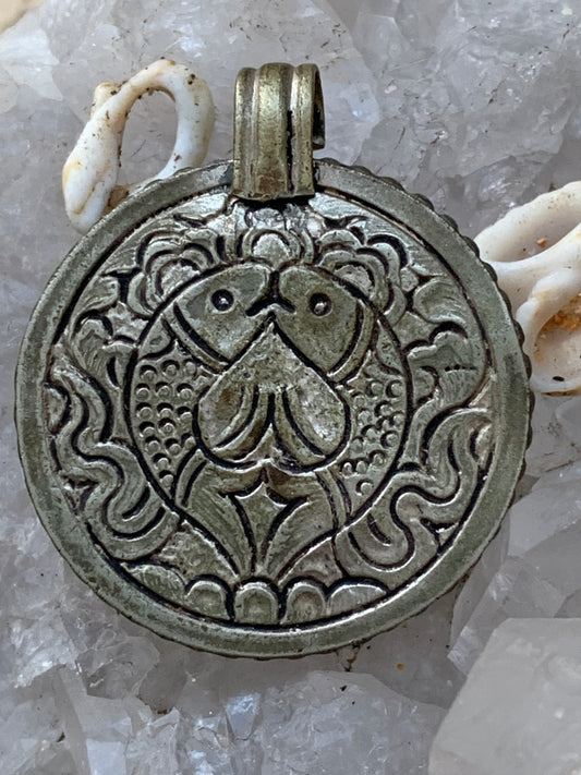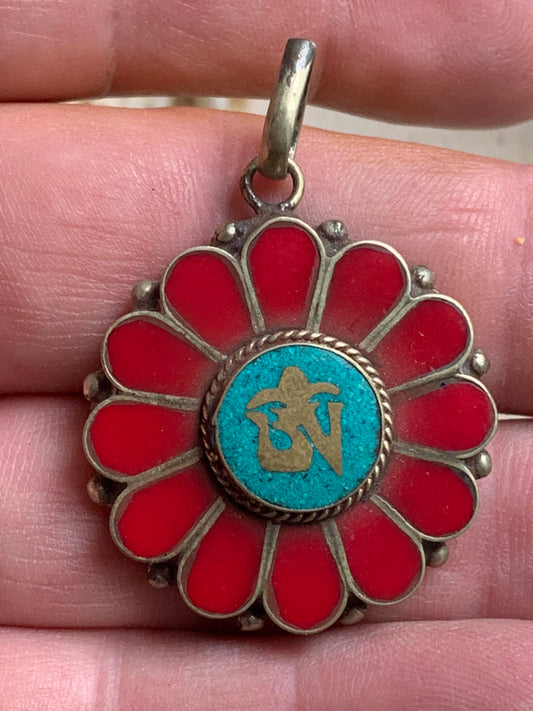 Corail et turquoise sertis sur pendentif en métal argenté de type laiton avec le symbole Om au centre. 30 millimètres de diamètre x 8 d'épaisseur. Vendu avec cordon noir réglable offert !