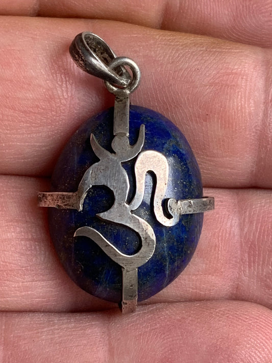 Lapis lazuli, superbe pendentif en métal argenté de type laiton avec le motif Om. 35 millimètres de hauteur x 20 x 10. Vendu avec cordon noir réglable offert !