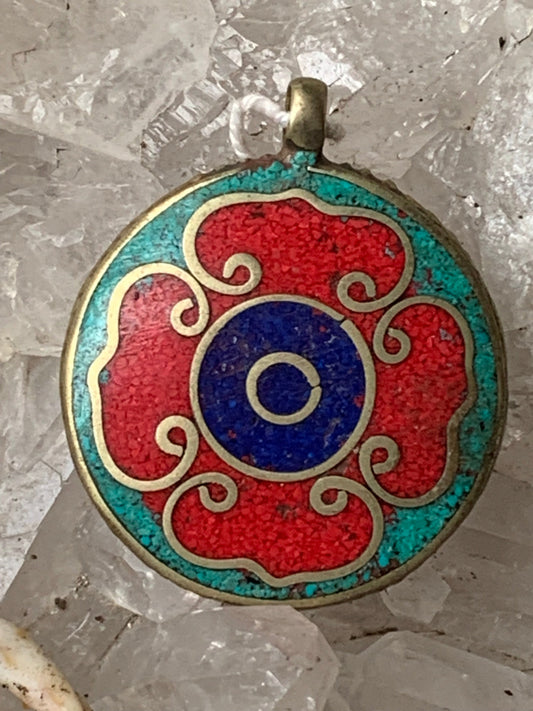 Corail, turquoise et lapis lazuli sertis sur pendentif en métal argenté de type laiton avec le symbole Om au centre. 30 millimètres de diamètre x 6 d'épaisseur. Vendu avec cordon noir réglable offert !