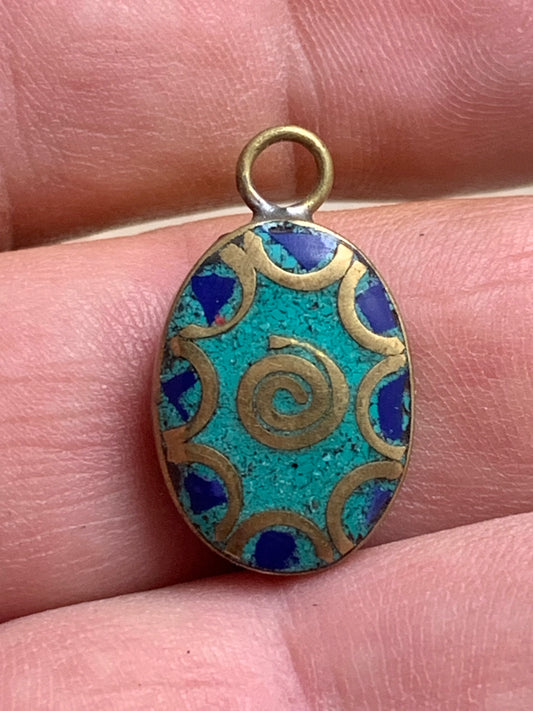 Turquoise et lapis lazuli sertis sur pendentif en métal argenté de type laiton. 20 millimètres de hauteur x 15 de largeur x 5 d'épaisseur. Vendu avec cordon noir réglable offert !