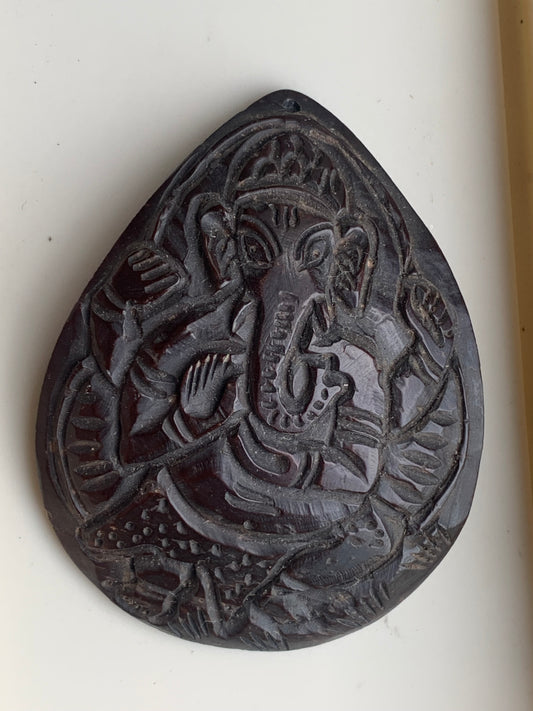 Ganesh, coquille de noix de coco gravé, pièce unique en Argent de 65 mm x 60 x 4. Vendu avec un cordon réglable de couleur noire !