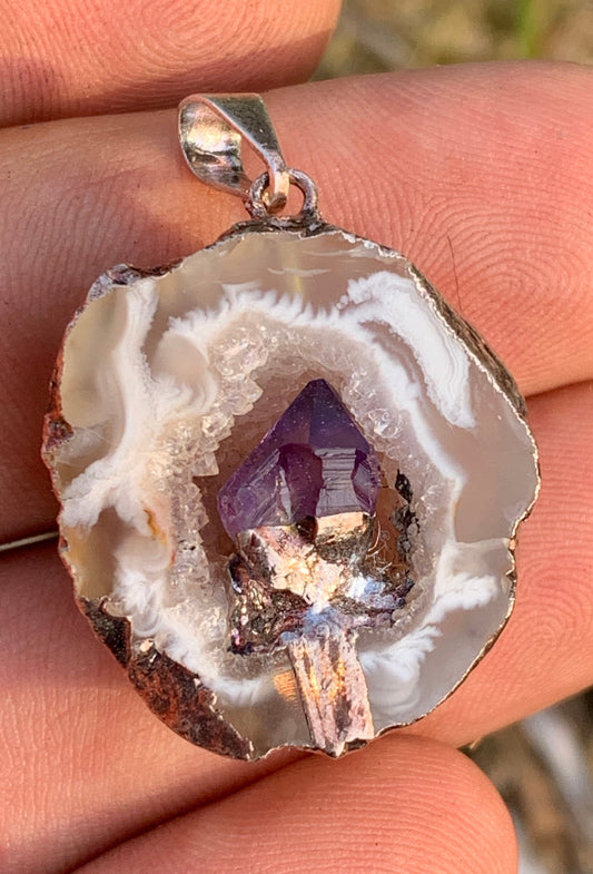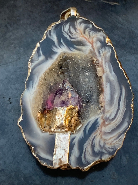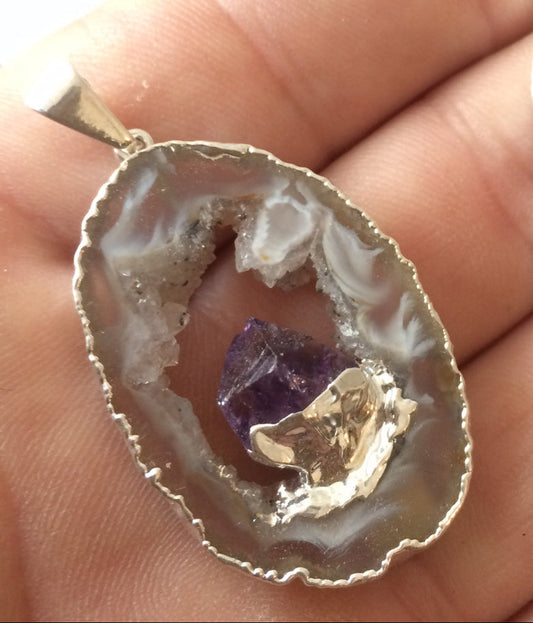 Améthyste et Agate, pendentif 'mini-géode' dit 'geodinhos', de 42mm de hauteur x 18 x 14. Vendu avec cordon noir réglable offert !