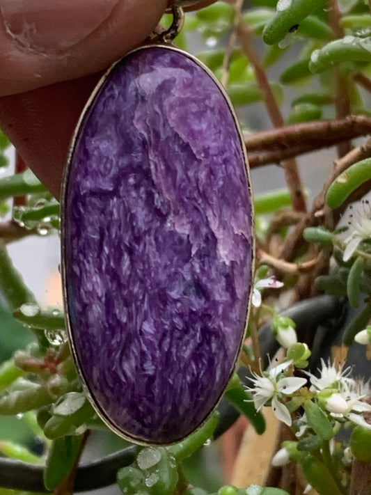 Charoïte, pendentif serti en Argent massif de 50mm x 17 x 8. Vendu avec cordon noir réglable, prêt à porter !