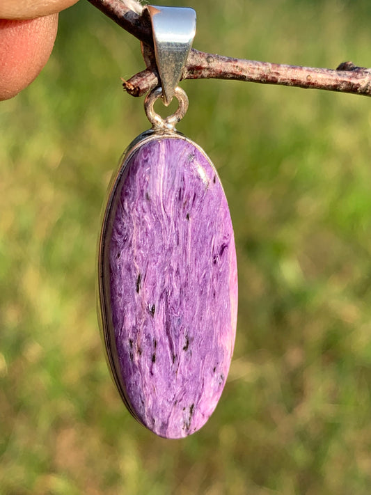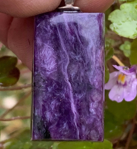 Charoïte, magnifique pendentif en Argent 925 de 35mm de hauteur x 18 de largeur x 7 d'épaisseur. Vendu avec cordon réglable de couleur noire !