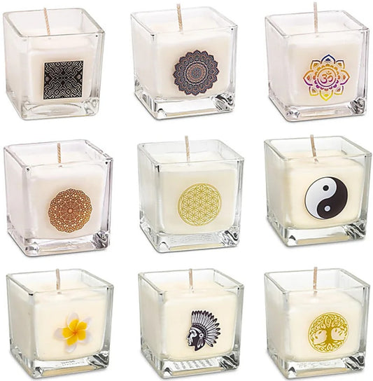 Bougies '7 chakras' en pot, en cire de colza, 25 H. de combustion - 6x6x6 cm - 88 grammes par pot !