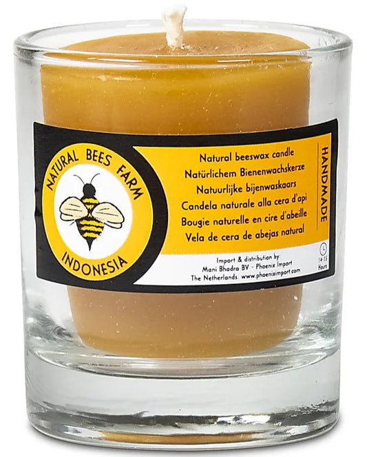 Bougie votive 100% cire d’abeille, parfum miel, avec verre. 14–16h de combustion. À l’unité ou pack de 12 !