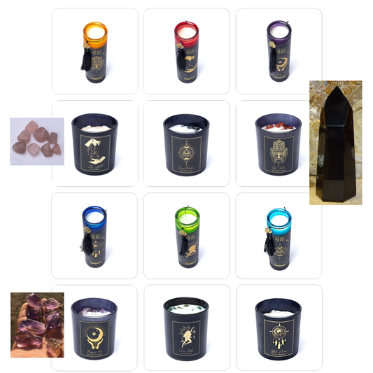 Bougies 'd'intentions' aux huiles essentielles et avec pierres précieuses, de chez 'Song of India'. 20 ou 80H de combustion ! Lorsque la bougie brûle, les pierres précieuses coulent avec la cire, une fois terminée, vous conserver les pierres !