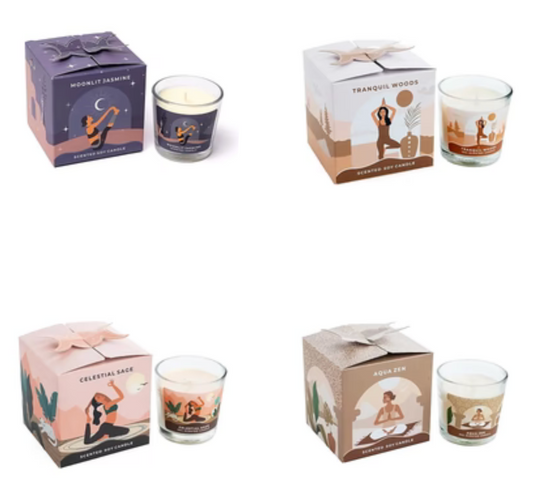 Bougie de chez 'Moonshine Yoga' (cire de soja) parfumée aux huiles essentielles naturelles. Mèche en coton pur. 5.5x6 cm - 60gr. - ± 12H de combustion.