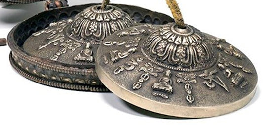 Cymbale TibétaineTingsha, avec gravure des symboles auspicieux Bouddhiste, 3 tailles au choix de 5,5 à 7,5 cm. Utilisées comme offrandes musicales !