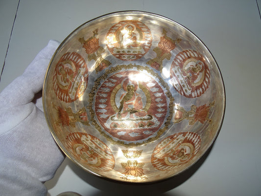 Bol chantant plaqué Argent, 4 tailles (20-30 cm), décor Bouddha et symboles auspicieux. Livré avec maillet & gant.