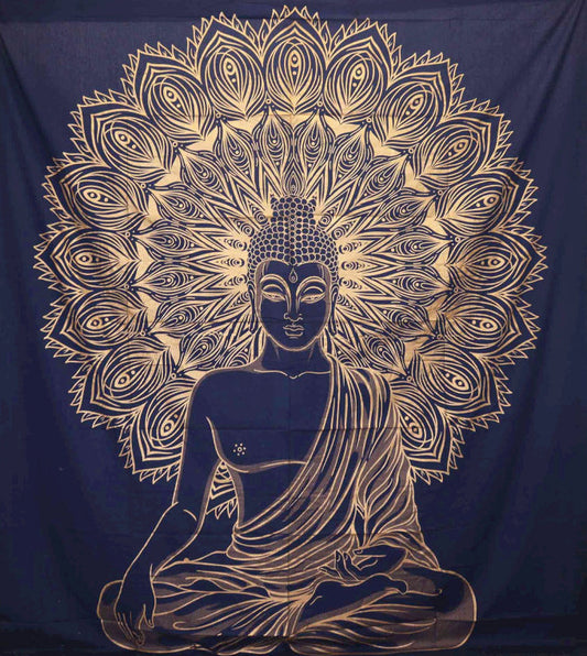 Tenture Murale/ Couvre-Lit Double en Coton - Bouddha - Or & Bleu - 230 x 200 cm