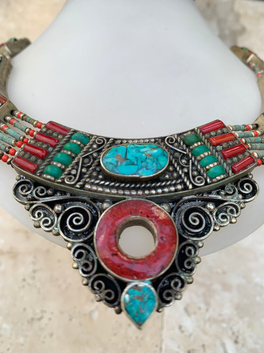 Superbe collier/ parure en perle et cabochon de turquoise et de corail. 45 cm de long. Fait au Népal (Katmandou) ! Véritable œuvre d'art !