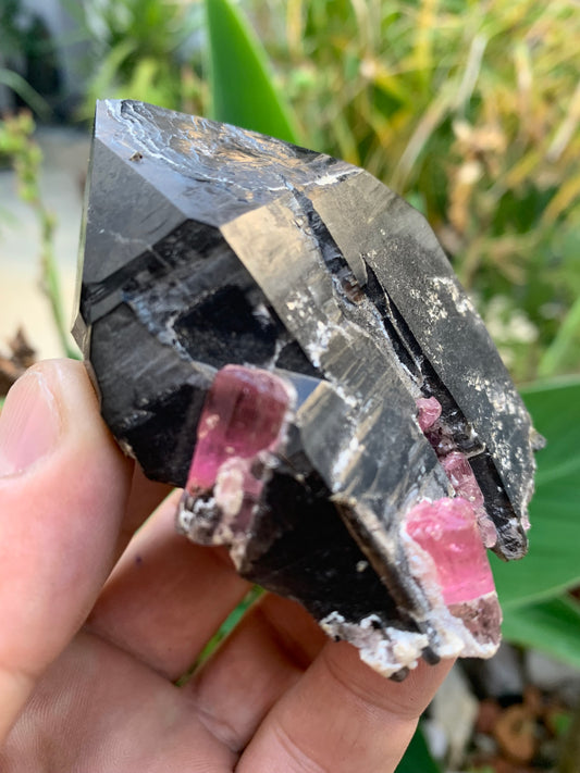 Cristal de roche fumé/ Quartz Morion / Quartz Fumé avec Tourmaline Rubellite, incroyable spécimen naturel de 90 x 70 x 48mm - 216 grammes. Superbe pièce !