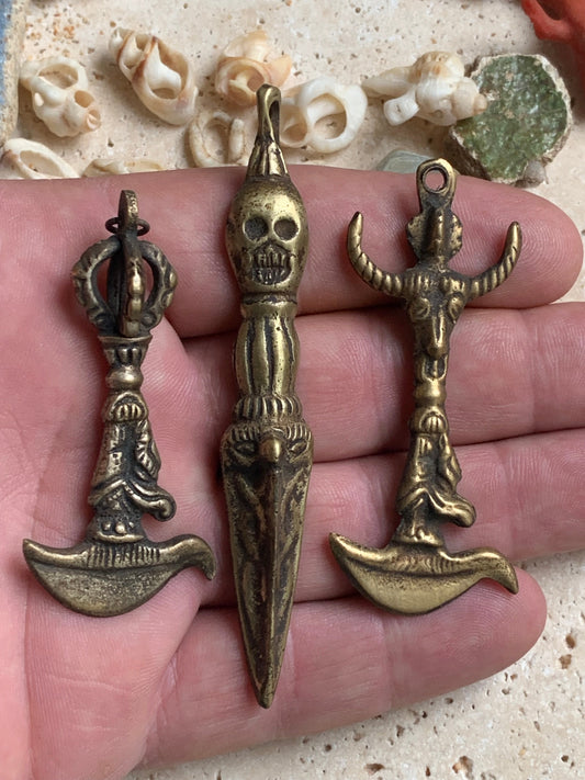 Pendentifs anciens artisanaux du Népal, 3 modèles au choix sculptés dans du laiton, symbole de Phurba* (couteau de rituel), De 60, 70 et 90 millimètres de hauteur. Vendu avec cordon noir réglable offert, parfait !