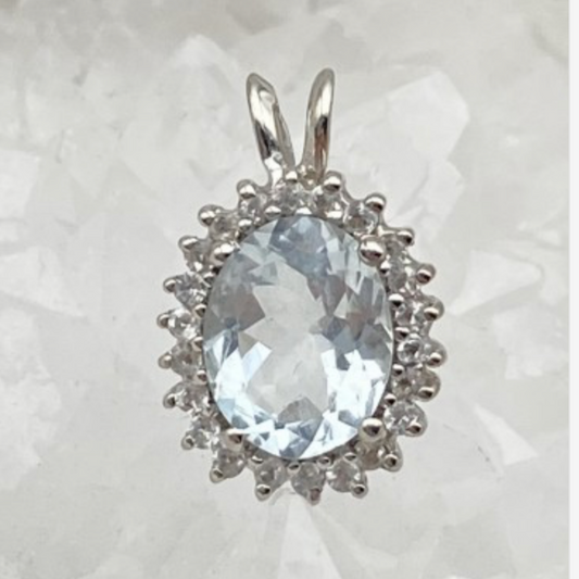 Aigue-marine | Collection Retro' | Pendentif en Argent serti d'une pierre gemme de forme ovale, entouré d'Oxyde, 16x10 mm !