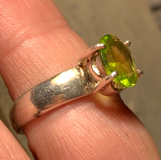 Élégante bague en 'Péridot' (pierre à facettes), sur monture en métal Argent 0.925 ! Superbe pierre, très belle réalisation. Taille 56 Fr.