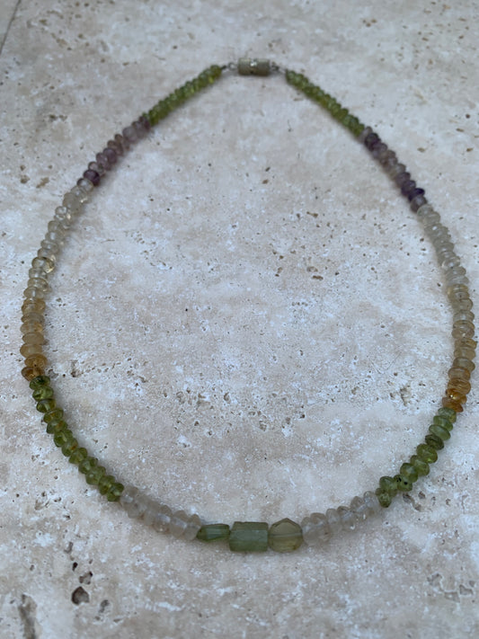 Fil de perle de type 'rondelle' en mix d'améthyste, cristal de roche, citrine, et péridot. Vendu en bracelet de 17 à 21 cm ou en collier de 42 cm - Perles 4 à 5 mm. Superbe pièce !