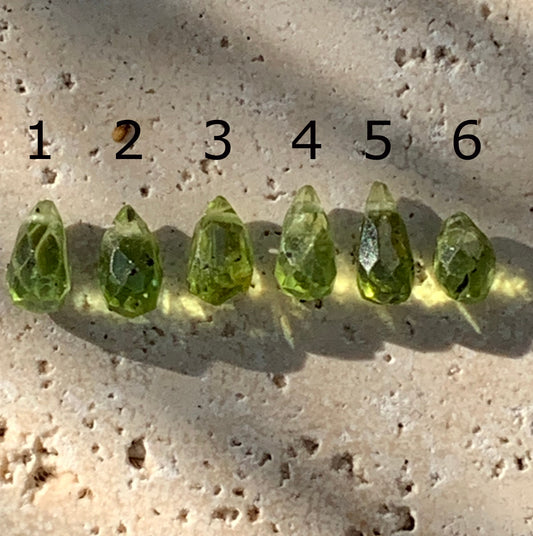 Péridot, perles facettées et percés (briolettes), vendus en lot ou à l'unité, de 8mm x4 de diamètre environ - 1 gramme (lot). Parfait en collection, bijouterie, exposition...
