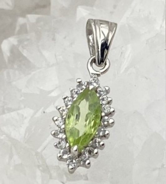 Péridot | Collection Retro' | Pendentif en Argent serti d'une pierre gemme en forme de 'navette', entouré d'Oxyde, 19 x 7 mm !
