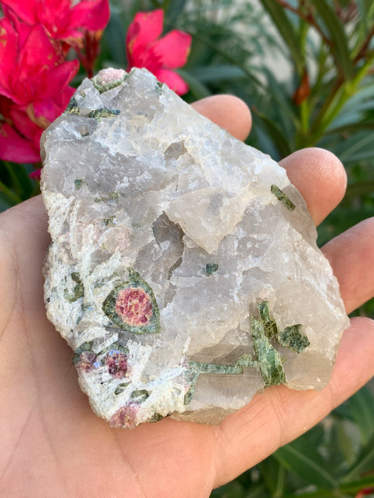 Tourmaline melon d'eau/ pastèque sur quartz, spécimen naturel de 94 x 74 x 28 mm - 226 grammes environ. Un bloc de quartz remplis de cristaux 'melon d'eau', superbe !