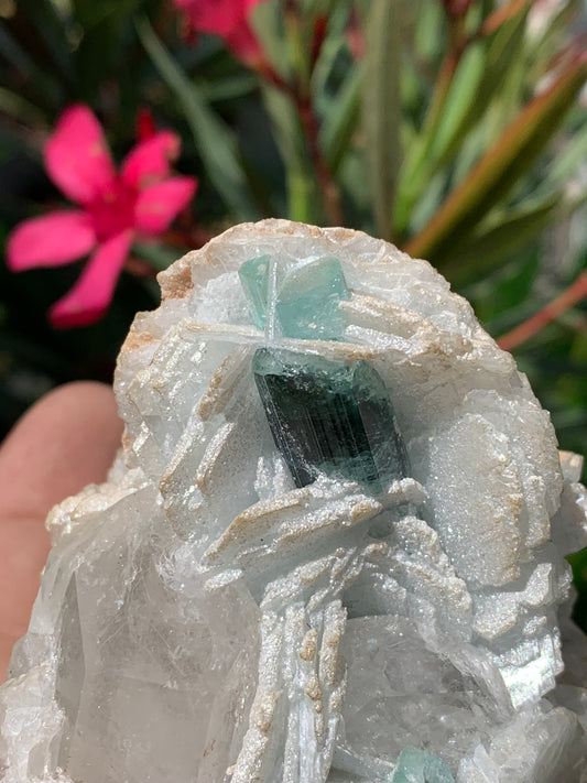 Tourmaline bleue/ Indicolite, spécimen naturel sur Quartz et Albite, de 73 x 62 x 66 mm - 293,5 grammes. Un trés beau cristal bleu transperçant !