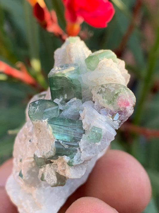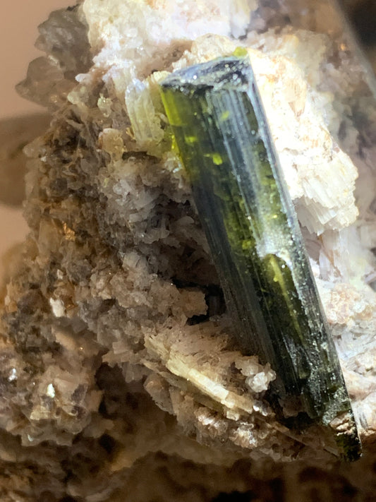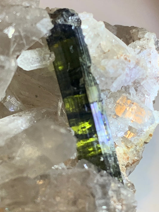 Tourmaline verte/ Verdélite sur cristal de quartz, spécimen naturel de 47 x 40 x 36 mm - 38,7 grammes environ. Magnifique pièce de verdélite au milieu de cristaux de quartz facettés !