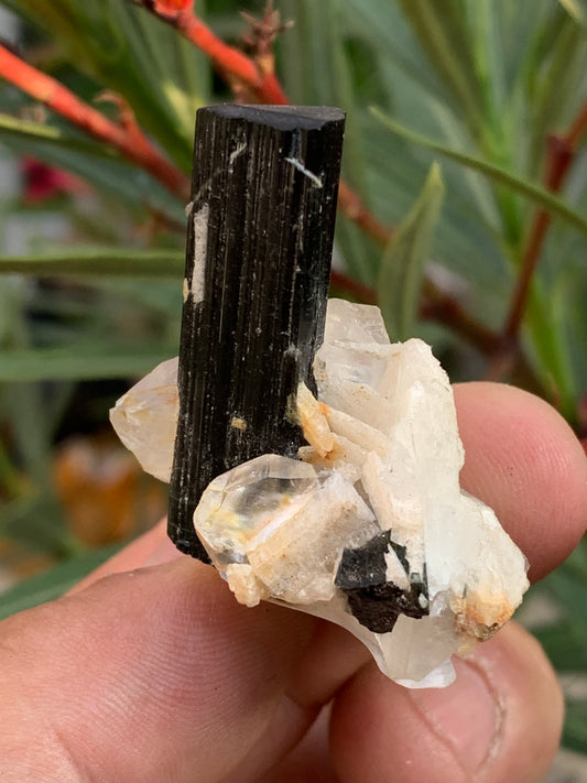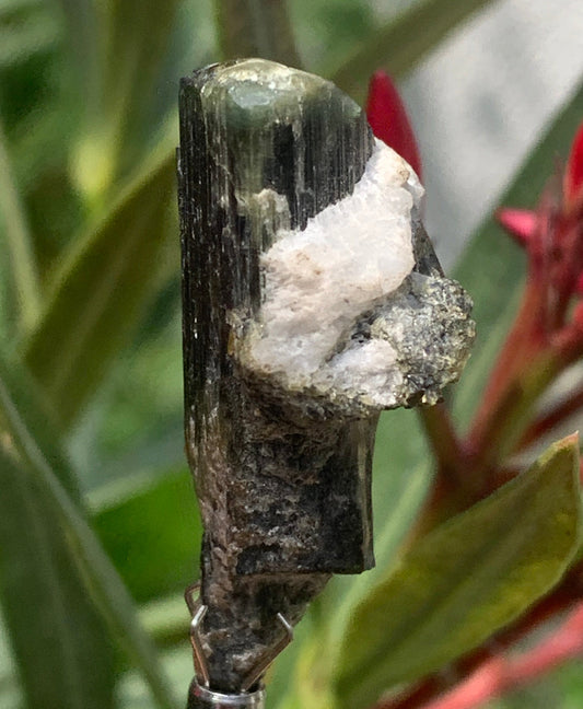 Tourmaline verte/ Verdélite sur cristal de quartz, spécimen naturel de 46 x 35 x 33 mm - 27,7 grammes environ. 1 magnifique cristal traversé par une pointe de tourmaline à terminaison verte !