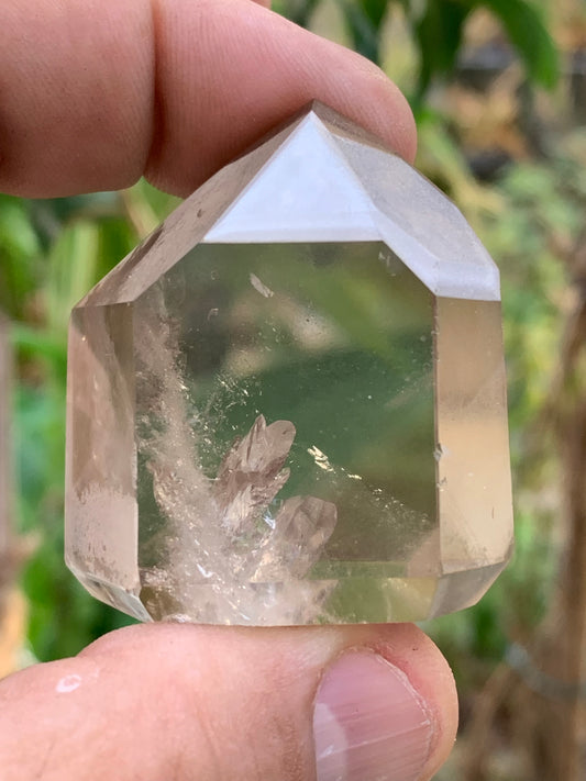 Cristal de roche fumé/ Quartz fumé, pointe naturelle de 44x41x27mm - 71 gr. Superbe triangle et hexagone qui ressortent, unique !