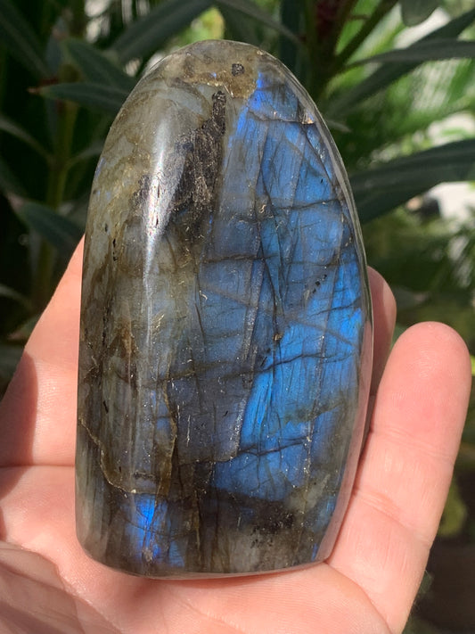Labradorite, forme libre de qualité AA, 1 face polie 1 face brute, 150 x 150 x 60 mm - 1650 grammes environ. Très belle qualité, des reflets hologramme incroyable !