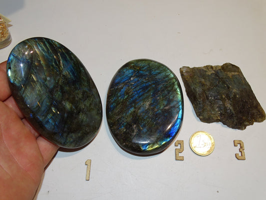 Labradorite, 2 pierres plates XL, modèles au choix, environ 100 x 65 x 23 mm - 225 grammes environ + 1 morceau brut 1 face polie. Très belle qualité, des reflets hologramme incroyable !
