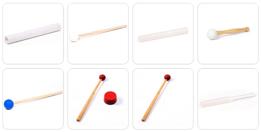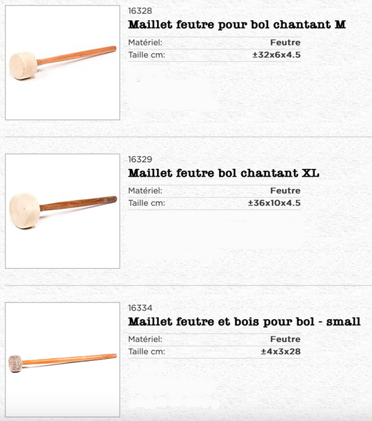 Sélection de maillets divers, + de 30 modèles en 1 coup d'oeil ! Pour bol chantant et gong et autres, plusieurs modèles et tailles au choix !