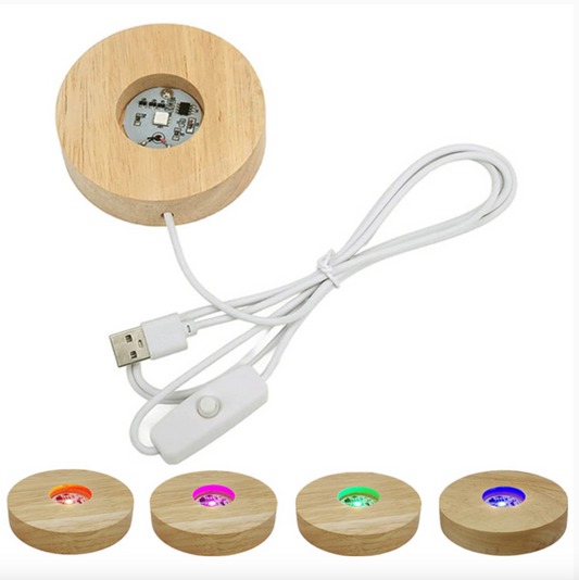 Base LED multicolore – Socle en bois avec prise USB – Illuminez vos minéraux et spécimens transparents (Ø 10 x H 2 cm, 5V) !