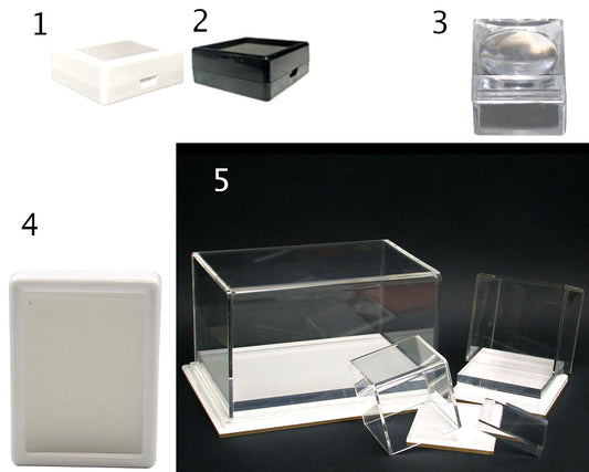 Boîtes de différents formats pour rangement et présentation de cristaux – Vente à l’unité ou en pack – Couvercles, modèles “loupe” et “deluxe” !