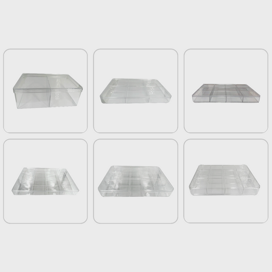 Sélection de boîtes en PVC avec couvercles coulissants – 2 à 15 compartiments – Idéal pour minéraux, cristaux et bijoux – Dimensions 22 à 35 cm !