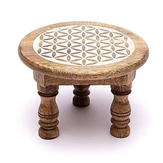 Petit tabouret/ Autel avec impression de couleur blanche de la 'Fleur de Vie'. Taille 15x10 cm - 352 grammes. Adorable petit meuble !