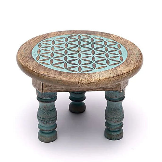 Petit tabouret/ Autel avec impression de couleur bleue de la 'Fleur de Vie'. Taille 15x10 cm - 352 grammes. Adorable petit meuble !