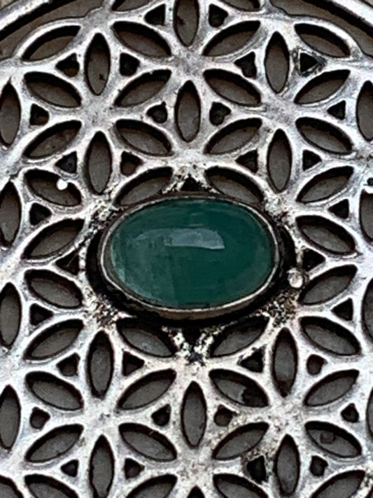 Pendentif en Argent 925 en forme de Fleur de vie avec une émeraude au centre, de 25 millimètres de diamètre. Vendu avec cordon noir réglable offert, parfait !